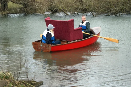 Our journey followed a route that existed in the 1940s, taking cycle paths and tracks and crossing roads, fields, and even a river. At the site of the old Marston ferry, we rowed the sofa across the Cherwell in a leaky wooden dinghy. Our journey commemorates the life of Peggy Oates and is recorded in this video.